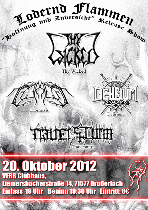 Auftritt am 20. Oktober 2012 zusammen mit Thy Wicked, Thormesis & Delirium im VFRR e.V. Klubhaus in Großerlach. Nähere Infos auf www.vfrr.de
